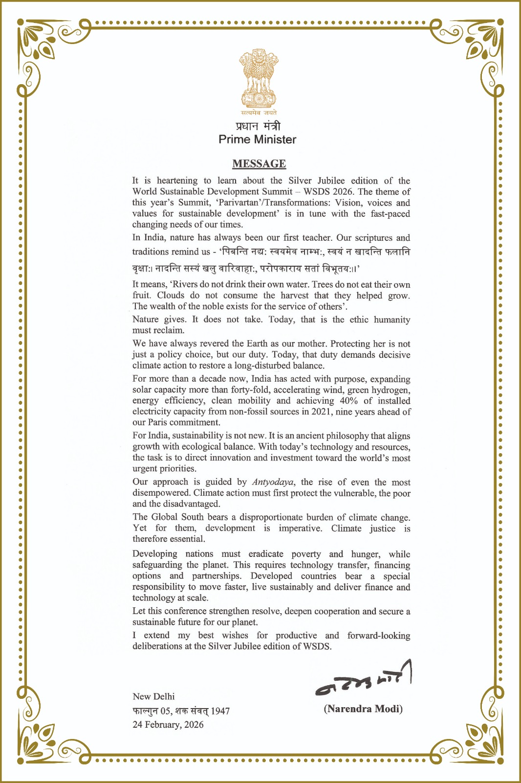 The Hon’ble Prime Minister of India, Shri Narendra Modi shared a message on the occasion of the Silver Jubilee edition of the World Sustainable Development System. An excerpt from the message—“Our approach is guided by Antyodaya, the rise of even the most disempowered. Climate action must first protect the vulnerable, the poor, and the disadvantaged. The Global South bears a disproportionate burden of climate change. Yet for them, development is imperative. Climate justice is therefore essential.”